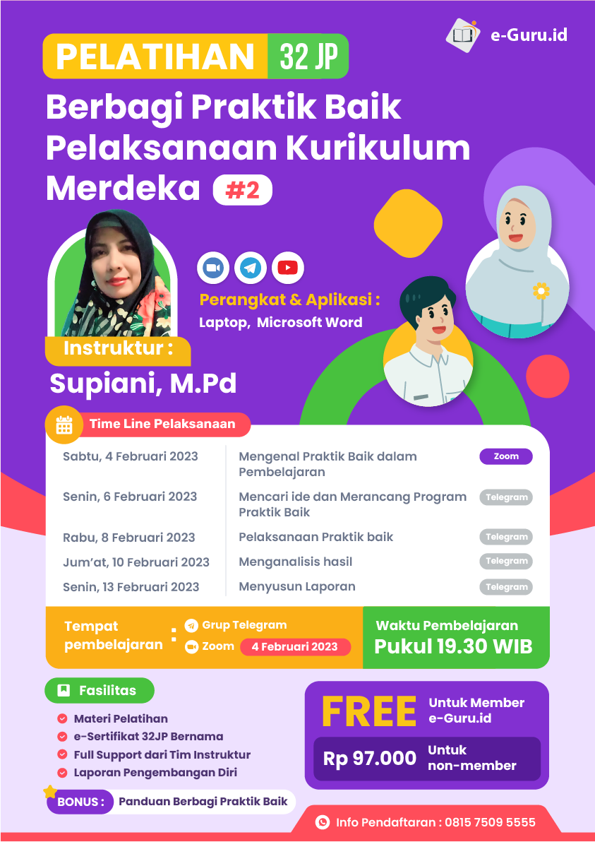 E-guru.id mengadakan pelatihan bersertifikat 32JP dengan judul “Berbagai Praktik Baik Pelaksanaan Kurikulum Merdeka” Diklat akan diadakan 4- 13 Februari 2023 dengan instruktur yang luar biasa. Selain itu setiap peserta mendapatkan fasilitas lengkap seperti materi pelatihan, e-sertifikat 32JP, full suport dari tim instruktur dan laporan pengembangan diri. Daftar Sekarang di link berikut https://online.e-guru.id/aff/40180/2279/checkout