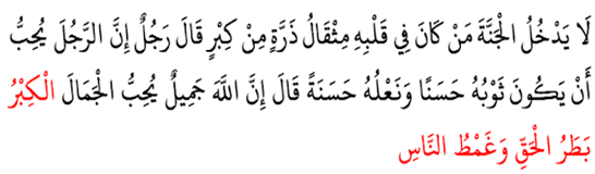 Tidak akan masuk surga seseorang yang di dalam hatinya terdapat kesombongan sebesar biji sawi. Ada seseorang yang bertanya, Bagaimana dengan seorang yang suka memakai baju dan sandal yang bagus? Beliau menjawab, Sesungguhnya Allah itu indah dan menyukai keindahan. Sombong adalah menolak kebenaran dan meremehkan orang lain. (HR. Muslim no. 91)