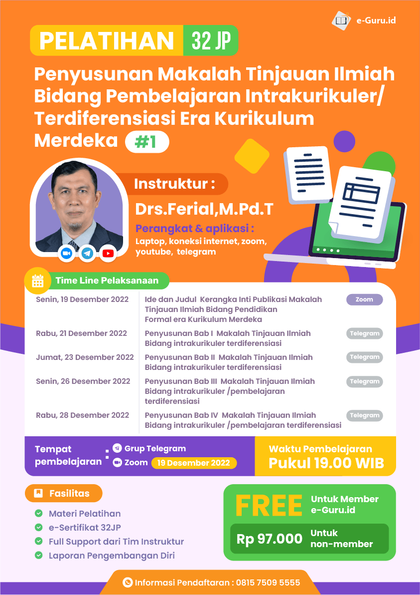 E-guru.id mengadakan pelatihan bersertifikat 32JP dengan judul “Penyusunan Makalah Tinjauan Ilmiah Bidang Pembelajaran Intrakulikuler Terdiferensiasi Era Kurikulum Merdeka” Diklat akan diadakan 19- 28 Desember 2022 dengan instruktur yang luar biasa. Selain itu setiap peserta mendapatkan fasilitas lengkap seperti materi pelatihan, e-sertifikat 32JP, full suport dari tim instruktur dan laporan pengembangan diri. Daftar Sekarang di link berikut https://online.e-guru.id/aff/40180/2203/checkout dan dapatkan seminar gratis serta bonus lainnya.
