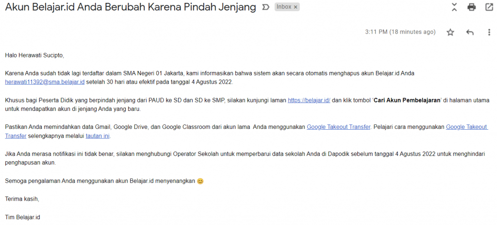 Email tersebut adalah pemberitahuan bahwa kedepannya akun lama Anda akan dihapus dan Anda akan mendapatkan akun baru sesuai jenjang Anda saat ini. Jangan khawatir, Anda akan diberikan waktu selama 30 hari untuk melakukan pemindahan data dari akun lama ke akun baru Anda menggunakan Google Takeout Transfer. Namun, apabila melebihi batas waktu 30 hari, maka Anda tidak dapat mengakses akun lama Anda lagi. Penting untuk diketahui, dalam periode waktu 30 hari ini, Anda dapat menggunakan dua akun Belajar.id tersebut secara bersamaan. Untuk mendapatkan akun baru di jenjang Anda yang baru, silakan lakukan pengecekan akun Belajar.id pada laman https://belajar.id/.