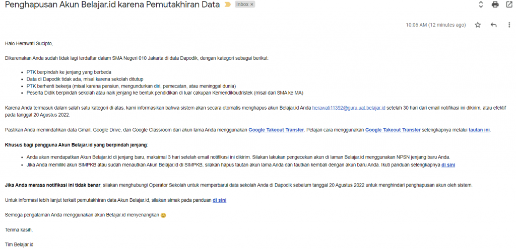 Apabila Anda mendapatkan email notifikasi seperti di bawah ini, Anda tercatat pada sistem Dapodik bahwa adanya perubahan data dan status pada akun Belajar.id Anda. Simak contoh email notifikasi berikut dan ketahui langkah selanjutnya: