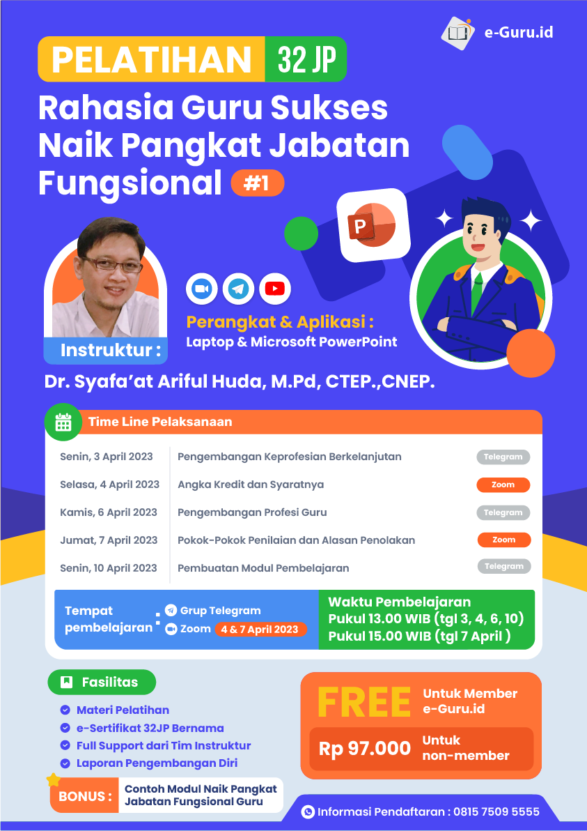 E-guru.id mengadakan pelatihan bersertifikat 32JP dengan judul “Rahasia Guru Sukses Naik Pangkat Jabatan Fungsional” Diklat akan diadakan 3- 10 April 2023 dengan instruktur yang luar biasa. Selain itu setiap peserta mendapatkan fasilitas lengkap seperti materi pelatihan, e-sertifikat 32JP, full suport dari tim instruktur dan laporan pengembangan diri. Daftar Sekarang di link berikut https://online.e-guru.id/aff/40180/2430/checkout dan dapatkan seminar gratis serta bonus lainnya.