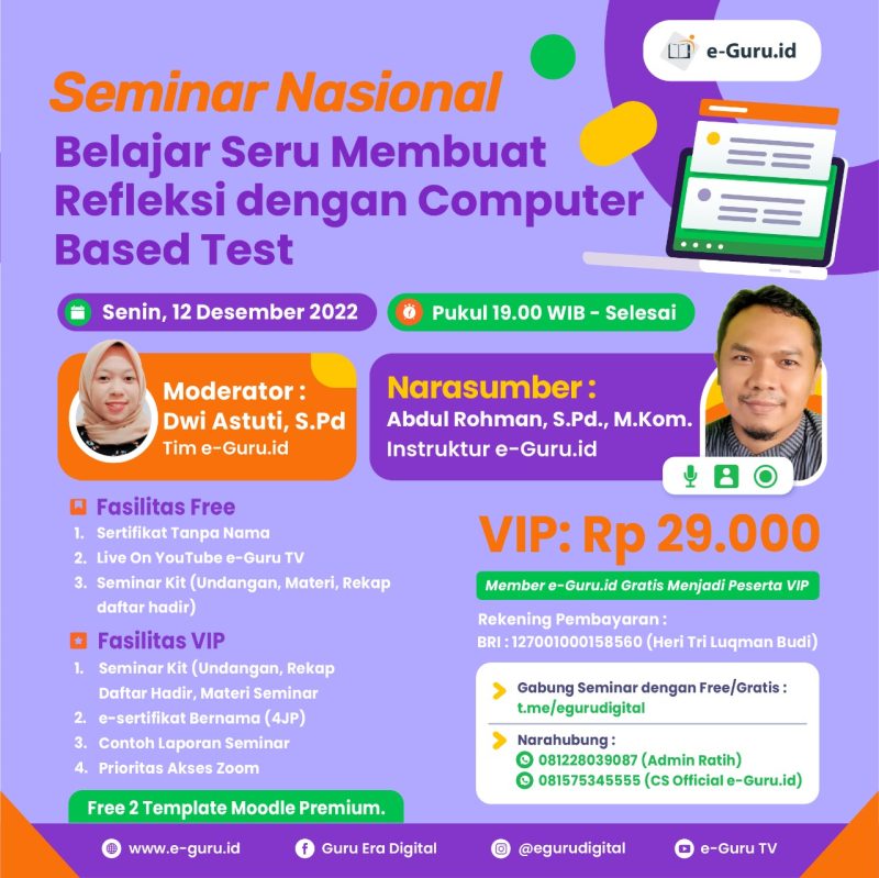 Yuk ikut Seminar Nasional Gratis Belajar Seru Membuat Refleksi dengan Computer Based Test. Daftar Sekarang di link pendaftaran berikut http://online.e-guru.id/aff/14894/2225/checkout