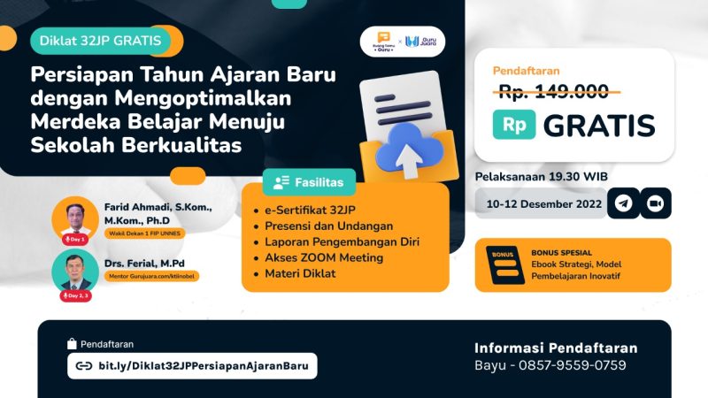 Maka dari itu, Guru Juara telah mengadakan Diklat 32 JP GRATIS “Persiapan Tahun Ajaran 2023 dengan Mengoptimalkan Merdeka Belajar Menuju Sekolah Berkualitas”pada 10-12 Desember 2022 pukul 19.30 WIB, dengan rincian materi sebagai berikut,