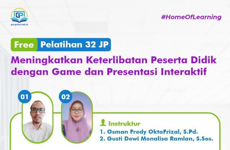 Gurupintar.web.id Kembali hadir mempersembahkan Free Pelatihan 32jp dengan judul Meningkatkan Keterlibatan Peserta Didik Dengan Game Dan Presentasi Interaktif. Pelatihan ini dapat diikuti secara gratis oleh guru di berbagai daerah di Indonesia secara daring melalui live zoom meeting dan live streaming youtube.