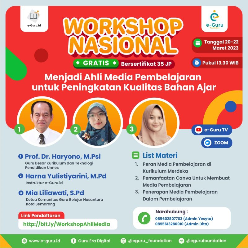e-Guru.id kembali mengadakan workshop nasional. Workshop kali ini spesial untuk semua pendidik, 100% gratis baik untuk member maupun non-member e-Guru.id. Materi yang dibahas juga sangat membantu pengembangan profesi guru. Apa itu? Yaitu Menjadi Ahli Media Pembelajaran untuk Peningkatan Kualitas Bahan Ajar.