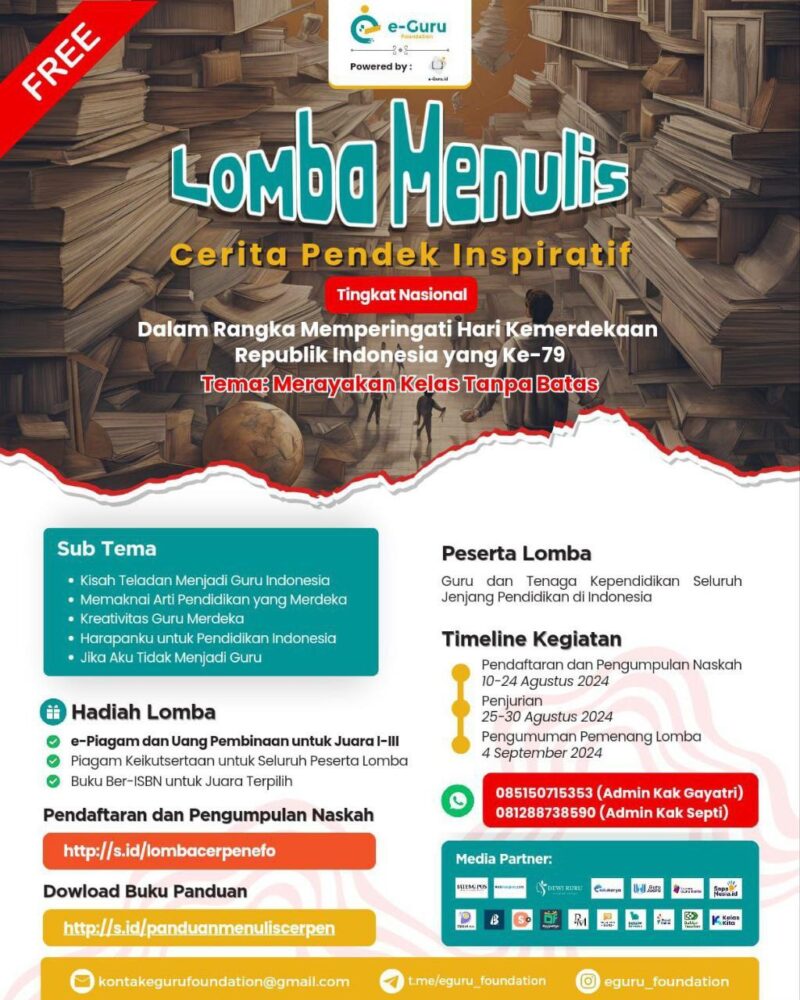 Dalam rangka memperingati Hari Kemerdekaan Republik Indonesia yang ke-79, e-Guru mengadakan Lomba Menulis Cerpen Inspiratif Tingkat Nasional dengan tema “Merayakan Kelas Tanpa Batas”. Lomba menulis cerpen khusus guru terbuka untuk seluruh guru dan tenaga kependidikan di seluruh jenjang pendidikan di Indonesia.