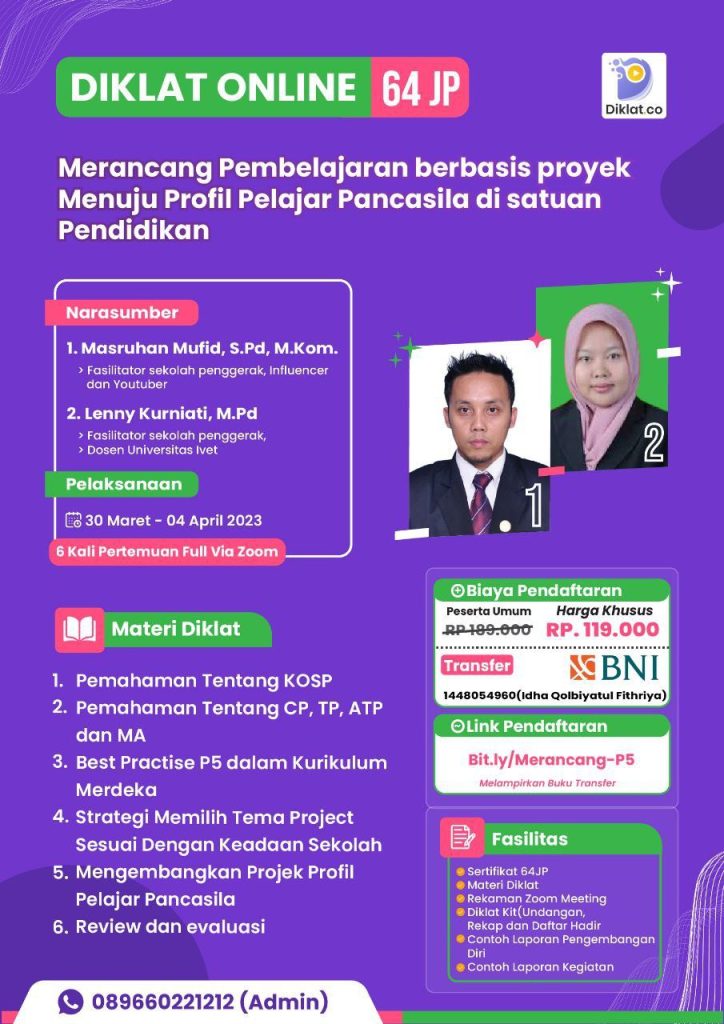 Narasumber kegiatan informasi diklat terbaru 2023 menghadirkan narasumber ahli yang tentunya akan mengampu kegiatan, diantaranya bapak Masruhan Mufid, S.Pd, M.Kom, beliau merupakan [Fasilitator Sekolah Penggerak, Influencer dan YouTuber, kemudian Bersama juga dengan ibu Lenny Kurniati, M.Pd, beliau adalah seorang Fasilitator Sekolah Penggerak, Dosen Universitas IVET Semarang.