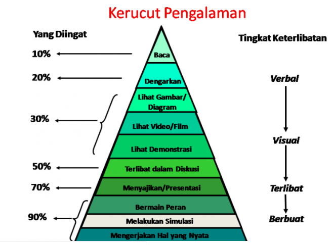 Kemampuan manusia untuk memperoleh ilmu pengetahuan dengan menggunakan alat indera yang dimilikinya, Edgar Dale yang terkenal dengan kerucut pengalamannya mengemukakan bahwa pengalaman belajar seseorang 75% di peroleh melalui Indra pengelihatan (mata), 13% memalui Indra pendengaran (telinga) dan melalui indera lainnya sekitar 12%.