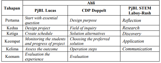 PjBL menurut ketiga ahli (Lucas, Doppelt, dan Laboy-Rush) dirangkum pada tabel berikut.