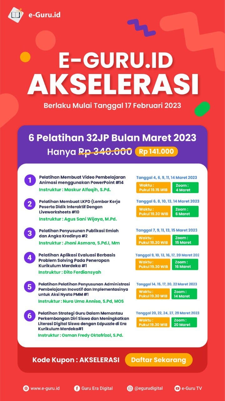 Khusus bagi peserta Diklat Nasional e-Guru.id, memberikan promo Cukup dengan biaya Rp141.000, PASTI DAPAT 6 SERTIFIKAT PELATIHAN 32JP!