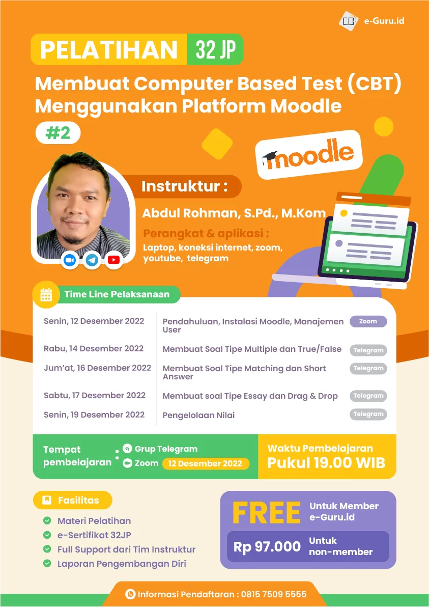 E-guru.id mengadakan pelatihan bersertifikat 32JP dengan judul “Membuat Computer Based Test (CBT) Menggunakan Platform Moodle” Diklat akan diadakan 12- 19 Desember 2022 dengan instruktur yang luar biasa. Selain itu setiap peserta mendapatkan fasilitas lengkap seperti materi pelatihan, e-sertifikat 32JP, full suport dari tim instruktur dan laporan pengembangan diri. Daftar Sekarang di link berikut https://online.e-guru.id/aff/40180/2198/checkout dan dapatkan seminar gratis serta bonus lainnya.