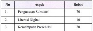 Metode penilaian presentasi dan wawancara menggunakan instrumen terkait terkait penguasaan substansi, literasi digital, dan kemampuan presentasi dengan 5 skala penilaian.