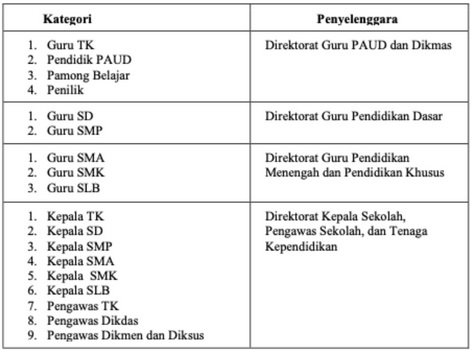 Kategori peserta Apresiasi GTK Inspiratif Tahun 2022 dan unit penyelenggaranya adalah sebagai berikut.