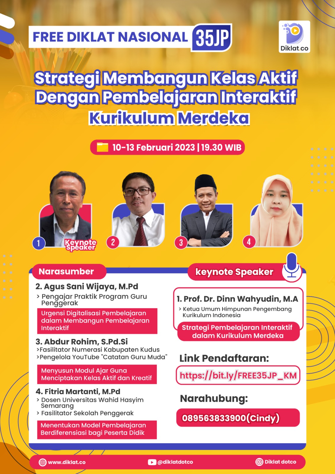 Diklat Nasional bersertifikat 35 JP dengan mengangkat judul Strategi Kelas Aktif Dengan Pembelajaran Interaktif dalam Kurikulum Merdeka, merupakan Diklat yang diselenggarakan oleh Diklat.co.
