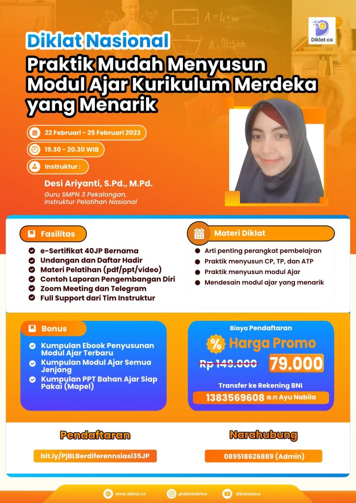 Untuk memahami lebih lanjut, silahkan ikuti Diklat Nasional 40JP: Praktik Mudah Menyusun Modul Ajar Kurikulum Merdeka. Pelaksanaan: 22 – 25 Februari 2023 (Seluruh Peserta Mendapatkan Sertifikat 64JP). Harga Khusus Rp79.000 saja. Daftar Sekarang : https://bit.ly/WL-ModulAjar40JP
