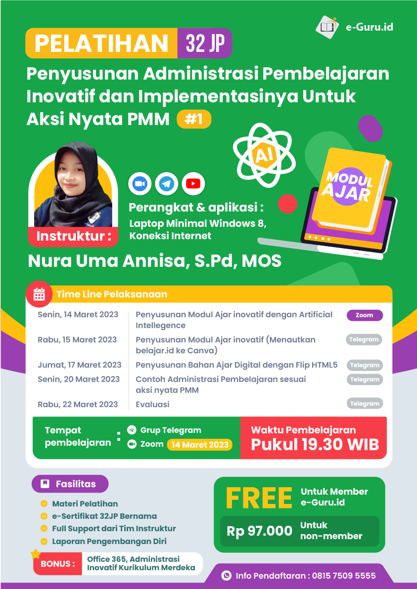 E-guru.id mengadakan pelatihan bersertifikat 32JP dengan judul “Penyusunan Administrasi Pembelajaran Inovatif dan Implementasinya Untuk Aksi Nyata PMM” Diklat akan diadakan 14- 22 Maret 2023 dengan instruktur yang luar biasa. Selain itu setiap peserta mendapatkan fasilitas lengkap seperti materi pelatihan, e-sertifikat 32JP, full suport dari tim instruktur dan laporan pengembangan diri. Daftar Sekarang di link berikut https://online.e-guru.id/aff/40180/2353/checkout dan dapatkan seminar gratis serta bonus lainnya.