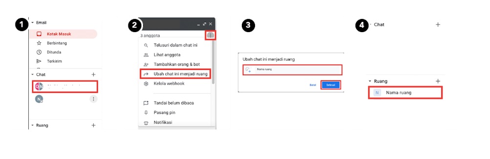 Jika Anda membuat chat grup, Anda dapat mengubahnya menjadi ruang. Saat menggunakan ruang, Anda dapat memberi nama ruang, berbagi file, dan menetapkan tugas kepada orang lain di ruang tersebut. Silakan ikuti langkah berikut untuk mengubah chat grup menjadi ruang: