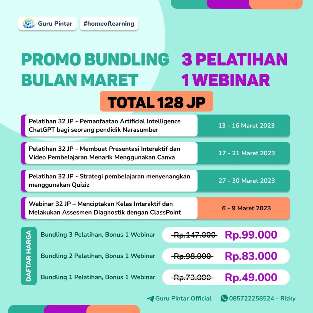 Untuk pemahaman lebih dalam mengenai penggunaan Classpoint ikuti serangkaian pelatihan yang diadakan oleh Guru Pintar Official pada bulan maret berikut ini :
