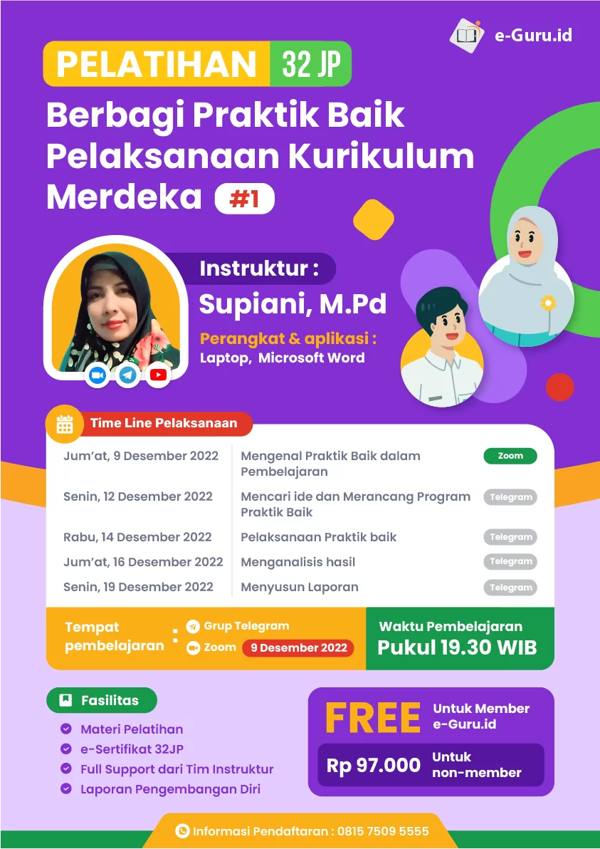 E-guru.id mengadakan pelatihan bersertifikat 32JP dengan judul “Berbagai Praktik Baik Pelaksanaan Kurikulum Merdeka” Diklat akan diadakan 9- 19 Desember 2022 dengan instruktur yang luar biasa. Selain itu setiap peserta mendapatkan fasilitas lengkap seperti materi pelatihan, e-sertifikat 32JP, full suport dari tim instruktur dan laporan pengembangan diri. Daftar Sekarang di link berikut https://online.e-guru.id/aff/40180/2197/checkout dan dapatkan seminar gratis serta bonus lainnya.
