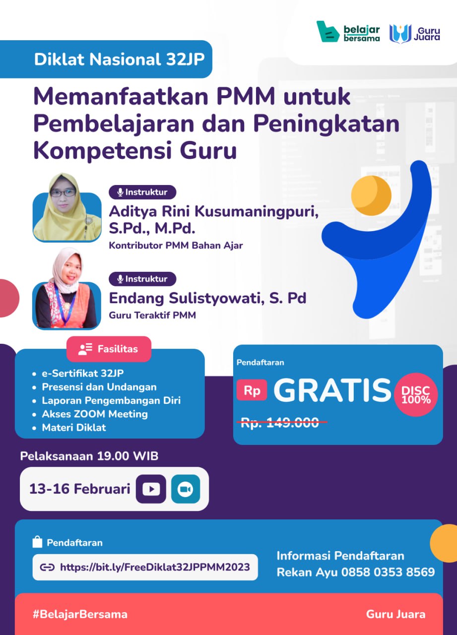 Untuk mendalami mengenai Pemanfaatan PMM untuk pembelajaran dan peningkatan kompentensi guru, anda dapat mengikuti Diklat Nasional Bersertifikat 32 JP dalam link berikut https://bit.ly/FreeDiklat32JPPMM2023. Apabila terdapat hal yang ingin ditanyakan, silahkan hubungi Rekan Ayu Tri dalam wa.me/6285803538569.