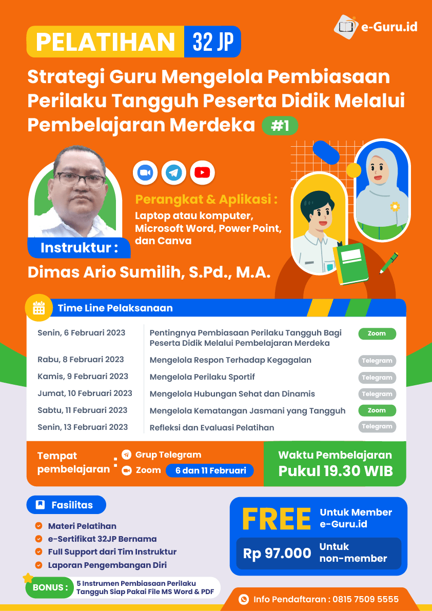 E-guru.id mengadakan pelatihan bersertifikat 32JP dengan judul “Strategi Guru Mengelola Pembiasaan Perilaku Tangguh Peserta Didik Melalui Pembelajaran Merdeka” Diklat akan diadakan 6- 13 Februari 2023 dengan instruktur yang luar biasa. Selain itu setiap peserta mendapatkan fasilitas lengkap seperti materi pelatihan, e-sertifikat 32JP, full suport dari tim instruktur dan laporan pengembangan diri. Daftar Sekarang di link berikut https://online.e-guru.id/aff/40180/2280/checkout dan dapatkan seminar gratis serta bonus lainnya.
