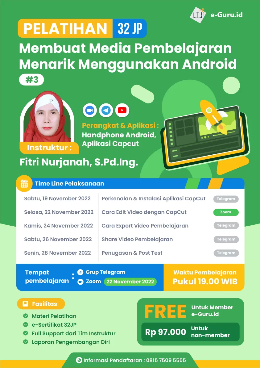 E-guru.id mengadakan pelatihan bersertifikat 32JP dengan judul “Membuat Media Pembelajaran Menarik Menggunakan Android” Diklat akan diadakan 19- 28 November 2022 dengan instruktur yang luar biasa. Selain itu setiap peserta mendapatkan fasilitas lengkap seperti materi pelatihan, e-sertifikat 32JP, full suport dari tim instruktur dan laporan pengembangan diri. Daftar Sekarang di link berikut https://online.e-guru.id/aff/40180/2153/checkout dan dapatkan seminar gratis serta bonus lainnya.