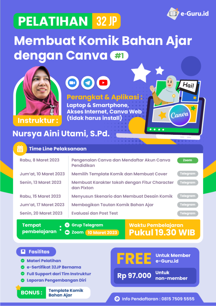 Anda seorang guru dan ingin mengikuti diklat gratis bersertifikat 32 JP? Yuk bisa ikut pelatihan dari e-Guru.id dengan topik “Membuat Komik Bahan Ajar Dengan Canva” maka Anda bisa melakukan pendaftaran dengan klik PENDAFTARAN DI SINI!