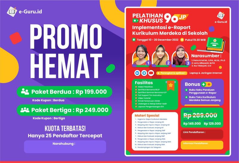 Promo Hemat dari e-Guru.id kembali menyelanggrakan Pelatihan Khusus Bersertifikat 90 JP akan segera dilaksanakan yaitu yang berjudul Implementasi e-Rapor Kurikulum Merdeka di Sekolah.