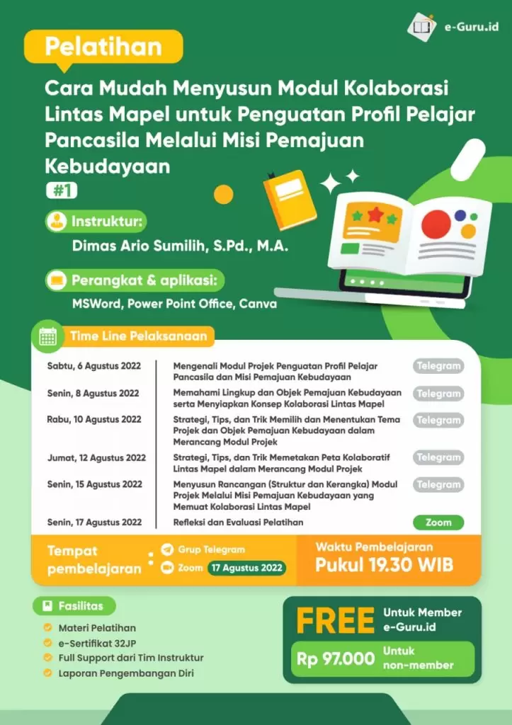 Segera daftarkan diri Anda dalam Pelatihan bersertifikat 32 JP “Kolaborasi Lintas Pelajaran Pada Modul Projek Penguatan Profil Pelajar Pancasila Melalui Misi Pemajuan Kebudayaan” yang akan dilaksanakan mulai tanggal 6-17 Agustus 2022 menggunakan aplikasi Zoom Meeting dan Telegram. Tunggu apa lagi? Daftarkan diri Anda sekarang juga sebelum kuota peserta penuh!