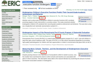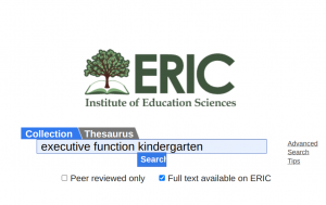 Dalam contoh kita umpamakan sedang mencari materi tentang executive function di TK, kita gunakan kata kunci “Executive Function Kindergarten“, tidak lupa kita centang “full text available on ERIC”.