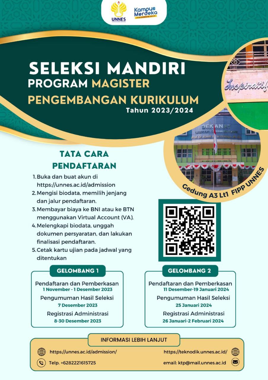 Universitas Negeri Semarang membuka Seleksi Mandiri Program Magister Pengembang Kurikulum Tahun 2023/2024.
