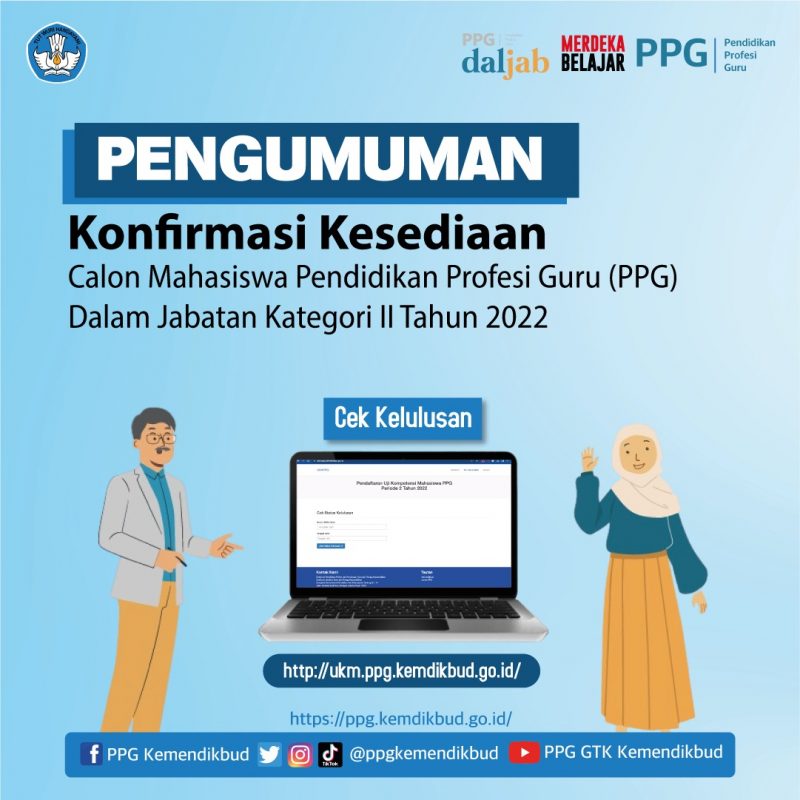 PPG Daljab Kategori 2 – Pengumuman mengenai konfirmasi kesediaan calon mahasiswa Pendidikan Profesi Guru (PPG) dalam jabatan kategori 2 tahun 2022 di umumkan melalui Instagram resmi PPG Kemdikbud.