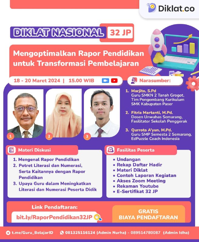 Daftar GRATIS! Diklat Nasional Bersertifikat 32 JP Mengoptimalkan Rapor Pendidikan untuk Transformasi Pembelajaran yang diselenggarakan mulai tanggal 18 – 20 Maret 2024 Pukul 15.00 WIB.